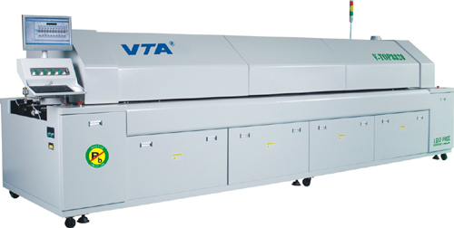 Top-grade large lead-free reflow Imported heating parts, uniform temperature, high thermal compensation efficiency, suitable for welding CSP and BGA components; Special wind wheel design, large air exchange and stable wind speed; Each temperature zone adopts forced independent circulation, independent PID control, and independent heating mode to make the furnace cavity temperature accurate, uniform, and large heat capacity: Heating up quickly, from room temperature to working temperature ≦ 30 minutes; The imported high-quality high-temperature high-speed motor has stable wind, low vibration and low noise; The furnace body adopts double cylinder (electric push rod) jacking device, which is safe and reliable; Synchronous speed transportation of chain and mesh belt, using frequency conversion precision and high speed; Special high-quality aluminum alloy rail design, small deformation, automatic chain refueling device; UPS power-off protection function ensures that the PCB board outputs normally after power-off, and is not damaged; Powerful software function, monitor and measure the temperature of the PCB board online, and analyze, store and print the data curve at any time; Industrial control PC and PLC communication adopt MODBUS protocol, work stably, prevent the phenomenon of crash; Automatic monitoring, showing the working status of the equipment, can be corrected at any time; Special patented furnace design, good thermal insulation, and the lowest power consumption in the same industry; The patented guide rail is not deformed at high temperature, and the three-wire rod synchronously widens the structure, effectively ensuring that the guide rails are parallel, preventing the board from falling, the occurrence of the card board, no-cleaning, and easy adjustment. The adjustment operation can be performed both automatically and manually. Standard chain and net chain synchronous iso-speed parallel transport, can process single-sided, double-sided PCB board, optional double rail transport system. The automatic width adjustment system adopts closed-loop PID control, which can automatically adjust to the required width according to the parameters input by the computer, and the accuracy can reach 0.2mm. Due to the modular design of each temperature zone, hot air motor and heating wire are easy to maintain and maintain. Forced centrifugal blast automatic air cooling system and rosin recycling system. |