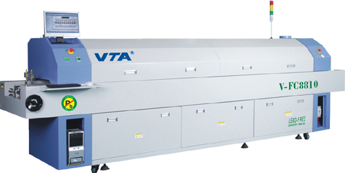 F series medium lead-free reflow soldering Features: 1. Adopt brand LCD computer + PLC intelligent control system, the temperature control accuracy is ±1 °C (if the computer crashes unexpectedly, it can realize offline work without affecting production), and ensure the control system is stable and reliable; 2.Windows2000 operation interface, powerful, easy to operate; 3. The upper furnace is opened with a double cylinder lifting machine to ensure safety and reliability; 4. Equipped with mesh belt tensioning device, the transportation is stable, no jitter, no deformation, ensuring smooth PCB transportation; 5. Synchronous rail transmission mechanism (can be connected to the automatic placement machine) to ensure accurate and high service life of the guide rail; (optional rail) 6. Automatically control the lubrication system, which can automatically lubricate the transmission chain by setting the refueling time and fueling amount; 7. All heating zones are PID controlled by computer (can be separately opened in the temperature division zone. Partition heating can be used to reduce the starting power); 8. The network/chain transmission is fully closed-loop controlled by the computer to meet the simultaneous production of different types of PCBs; 9. With fault sound and light alarm function; 10. With leakage protector to ensure the safety of operators and control systems; 12. Built-in UPS and automatic delay shutdown system to ensure that PCB and reflow soldering machine are not damaged when power is off or overheated; 13.Using the world's leading hot air circulation heating method of HELLER, high-efficiency supercharged accelerating air passage, greatly increasing circulating hot air flow, rapid temperature rise (about 20 minutes), high thermal compensation efficiency, high temperature welding and curing; 14. The temperature zone has independent temperature sensing sensors to monitor and compensate the temperature balance of each temperature zone in real time; 15. The operating system with password management prevents the unrelated personnel from changing the process parameters. The operation record management can trace the process of changing the process parameters to facilitate the improvement of management. It can store the user's existing temperature and speed settings and the temperature curve under the settings. Print all data and curves; 16. Integrated control window, computer switch, test curve, print curve and transmission data can be easily operated, and the design is user-friendly. Equipped with a three-channel temperature curve online test system, the actual temperature curve of the welded object can be detected at any time (no additional temperature curve tester is required); 17. The rapid cooling system from international technology adopts magnifying glass centralized high-efficiency quenching, the cooling speed can reach 3.5~6°C/sec, the management is very convenient; the external forced cooling device ensures the crystallization of solder joints (Option option, standard) Configured to force natural air cooling); 18. Rosin recovery system: rosin directional flow, replacement and cleaning is very convenient. Use dedicated pipeline to transport waste gas, life-long maintenance-free; 19.Special supercharged air transport structure and special-shaped heating wire design, no noise, no vibration, high heat exchange rate, the temperature difference Δt between BGA bottom and PCB board is extremely small, which is the most consistent with lead-free process. Requirements, especially for lead-free products with high welding requirements. |