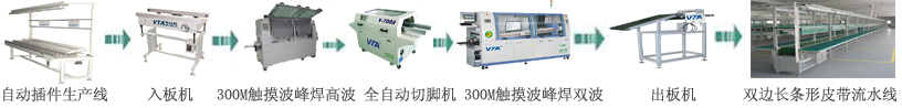 Automatic plug-in line 1. Unilateral operation: 2.4-3.0m/segment 2. Working surface height: 750±15mm 3.PCB width: 50-300mm continuously adjustable 4. Conveyor chain: 3/8" imported high quality nylon plastic chain 5. Drive system: WTW 60W speed motor 6. Conveying speed: 0.5-1.8m/min 7. Tripod light stand: 40*40 iron (aluminum square pass surface spray (computer gray) 8. Body size (single unit): L3000*W600*H2000mm 9. Power supply: single phase 220V Configuration 1. Lighting: 30W single-bracket hood light distribution tube 2 2. Process kanban: 15X25 aluminum profiles, each with 6 300X400 transparent acrylic plates 3. Parts table: 1.5mm iron plate bending forming (two layers) |
