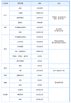 3、日本各公司自定的無鉛化目標(biāo)和用于批產(chǎn)的產(chǎn)品