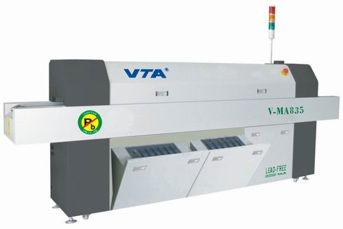 10.加熱系統(tǒng)采用高效節(jié)能的瑞典110伏鎳?yán)影l(fā)熱管,輻射功率峰值波長(zhǎng)4UM,配合曲面反射罩,熱效率高,升溫度速度快,特制強(qiáng)制熱風(fēng)循環(huán)結(jié)構(gòu)系統(tǒng),使PCB及元器件受熱均勻,完全消除“陰影效應(yīng)”。